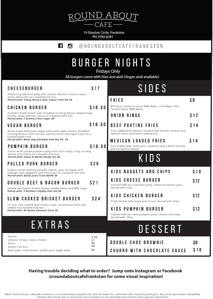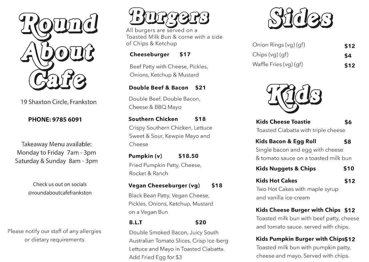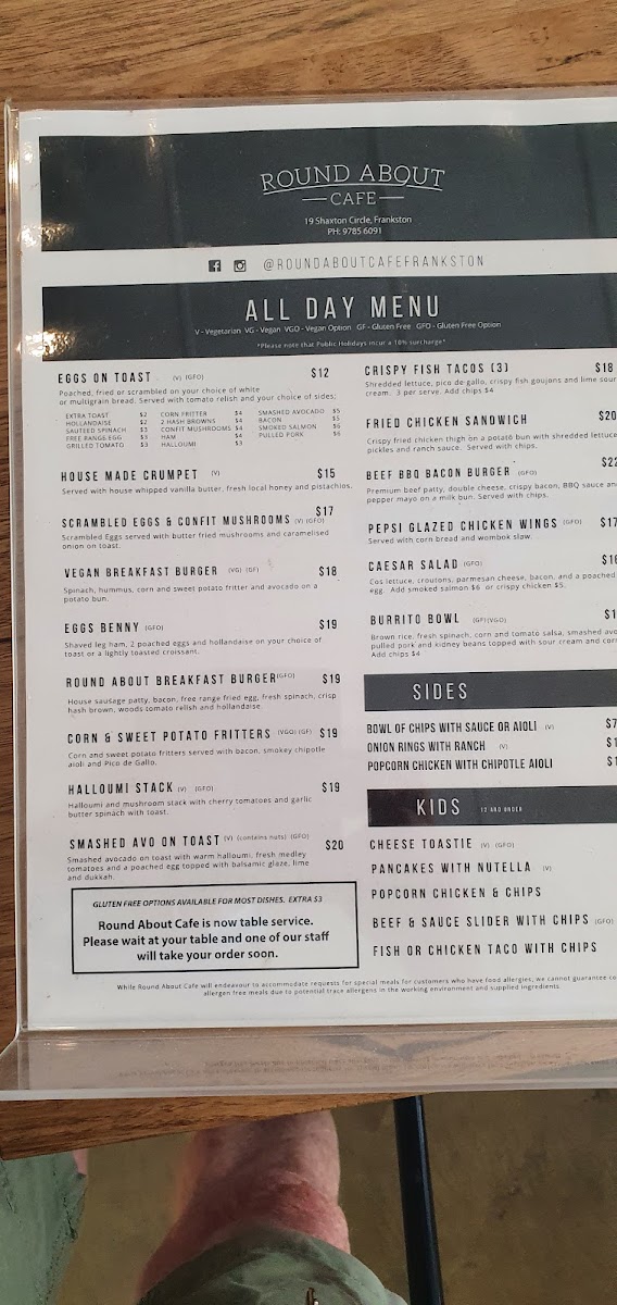 Step into a cozy haven at Round About Cafe Menu, where deliciousness meets comfort in the heart of Frankston. Located at Shop 1/19 Shaxton Cir, this charming cafe is perfect for a casual bite or a leisurely coffee break. Whether you're craving a hearty breakfast, a light lunch, or something to sweeten your day, the menu offers something for everyone. Fresh ingredients are the star, and each dish is crafted with care, ensuring every bite is satisfying. From rich, creamy coffees to vibrant salads and indulgent pastries, the cafe's offerings cater to all tastes. Whether you're in the mood for a quick snack or a relaxed meal with friends, you'll feel right at home here.